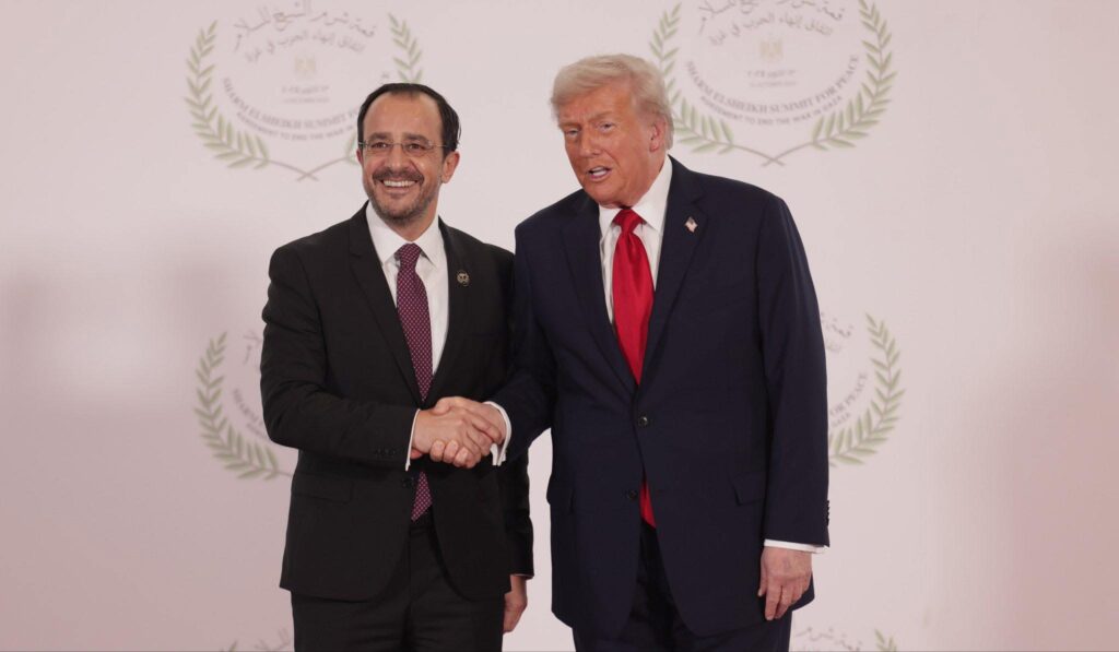 Güney Kıbrıs Rum Yönetimi lideri Hristodulidis, imza törenine katıldı, Erdoğan’ın sağ arkasında oturup görüntülere girdi. Aile fotoğrafında ön sırada yer aldı. Trump’la fotoğrafı paylaşıldı