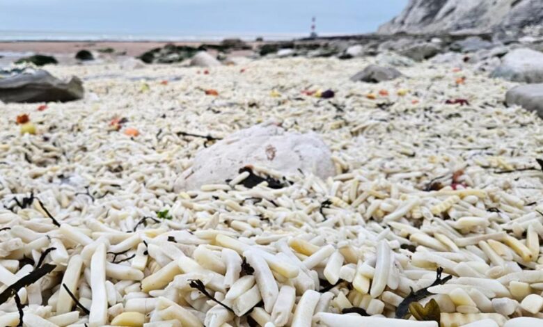 İngiltere’nin güneydoğusundaki Eastbourne kenti yakınlarında bir sahil, bu ayın başlarında bir kargo gemisinden düşen konteynerler nedeniyle binlerce paket dondurulmuş patates kızartması ve soğanla doldu.