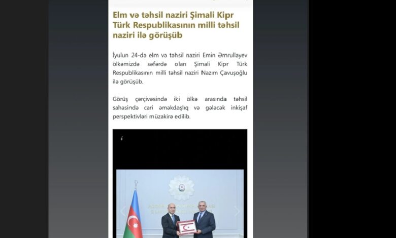 Paylaşımda, “ Azerbaycan Bilim ve Eğitim Bakanı Emin Emrullayev, ülkemizi ziyaret eden Kuzey Kıbrıs Türk Cumhuriyeti Milli Eğitim Bakanı Nazım Çavuşoğlu ile bir araya geldi” ifadelerine yer verildi. Görüşmede, iki ülke arasında eğitim alanındaki mevcut iş birliği ve gelecekteki gelişim perspektiflerinin ele alındığı belirtildi.