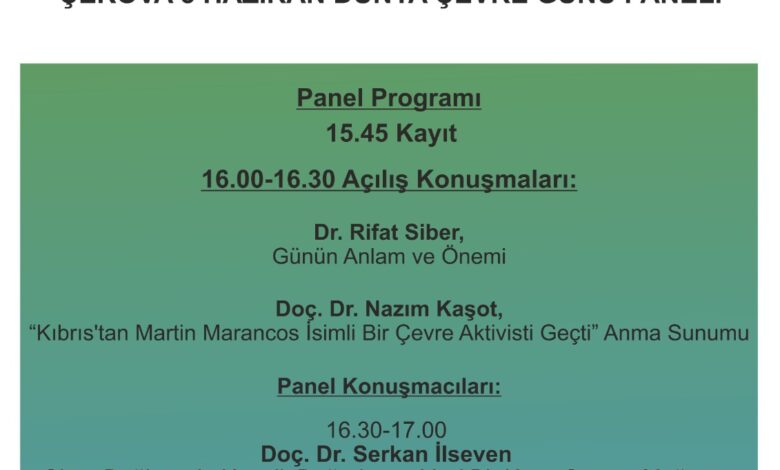 Çevre Koruma Vakfı (ÇEKOVA), 5 Haziran Dünya Çevre Günü dolayısıyla panel düzenliyor. Panel 5 Haziran tarihinde Kıbrıs Türk Tabipleri birliği konferans Salonu’nda saat 16:00’da başlayacak.