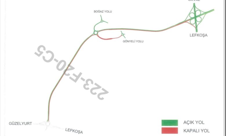 Lefkoşa Kuzey Çevre Yolunun Köprülü Kavşağı ile Alayköy Kavşağı yönü, gidiş güzergahında, yolun krokide gösterilen kesiminin trafiğe tamamen kapatılacağı kaydedilen açıklamada, Gönyeli-Boğaz Yolunun (Eski Gönyeli Yolu) krokide gösterilen kesiminde geliş ve gidiş olmak üzere her iki yönünün de transit geçişlere kapatıldığı bildirildi.