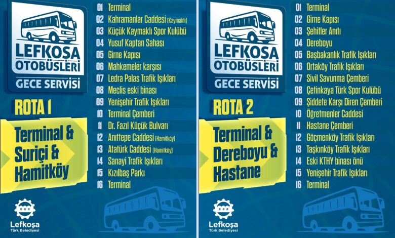 Lefkoşa Türk Belediyesi, haftanın 5 günü (Salı-Cumartesi) 19.00-01.00 saatleri arasında Lefkoşa genelinde toplu taşıma hizmetine başlıyor. 1 Temmuz Salı günü başlayacak ve 2 rota şeklinde hizmet verecek Lefkoşa Otobüsleri Gece Servisi’nin başlangıç ve bitiş noktası Otobüs Terminali olacak. Lefkoşa Toplu Taşıma Şirketi (L.T.T) ile imzalanan sözleşme kapsamında verilecek hizmetin bedeli her kullanım için 55 TL olacak ve kredi kartı ile ödenebilecek.