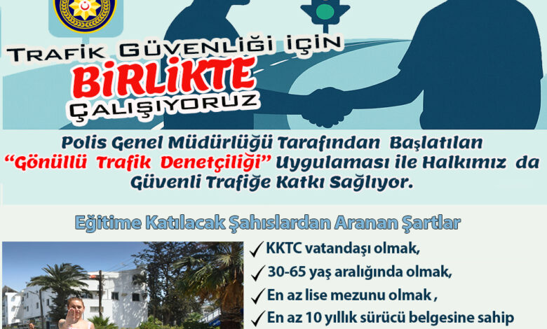 Açıklamada, “Gönüllü Trafik Denetçisi” adaylarında “KKTC vatandaşı olmak, 30-65 yaş aralığında olmak, en az lise mezunu olmak, en az 10 yıllık sürücü belgesine sahip olmak, adli sicili temiz olmak ve yüz kızartıcı herhangi bir suç işlememiş olmak, alkollü içki tesiri altında veya sürüş ehliyetsiz araç kullanmak suçlarından ceza almamış olmak ve ölümle neticelenen trafik kazasına karışmamış olmak.” aranacak.