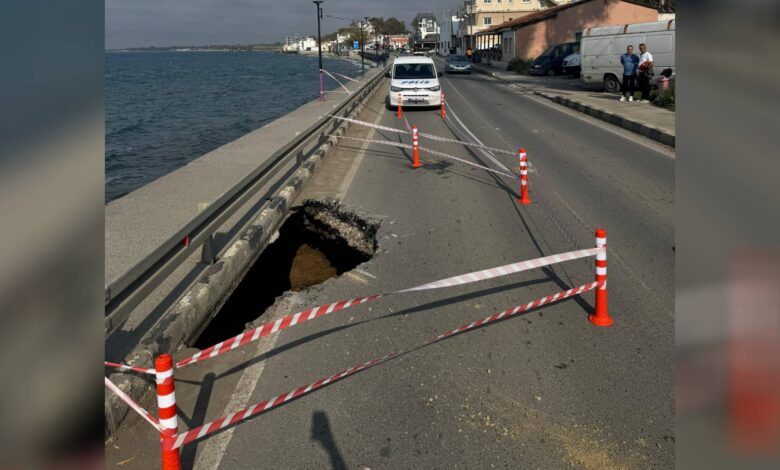 Yapılan açıklamaya göre, Bağlıköy Kavşağı’nın yaklaşık 100 metre gerisinde, yolun deniz tarafında çökme oluştu.