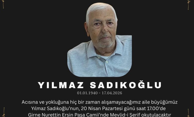 Geçtiğimiz Cuma günü 86 yaşında yaşamını yitiren Yılmaz Sadıkoğlu, için 20 Nisan Pazartesi günü saat 17.00’de Girne Nurettin Ersin Paşa Camii’nde Mevlid-i Şerif okutulacak. Ailesi tarafından yapılan çağrıda tüm sevenlerinin davetli olduğu duyuruldu.