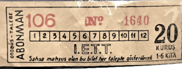 Biletçinin önünde tahtadan bir bilet kutusu bulunurdu. İçerisinde öğrenci/öğretmen, asker vb kişiler için ayrı ayrı biletler yer alırdı. Tam biletin üzerinde ise kare şeklinde 12 kutucuk bulunurdu. Biletçi yolcunun gideceği yere göre bu kutulardan birini işaretlerdi, bedelini de ona göre tahsil ederdi. Ayrıca aktarma yapılacaksa ayrı bir bilet kesilirdi. 60’lı yıllarda bu en pahalı biletin ederi 130 kuruştu. Öğrenci bileti için, 1960’ların başında iki bakır 10 kuruş öderdik. Daha sonraları enflasyon nedeniyle pirinçten sarı 25 kuruşla ödemeye başlamıştık. Bu kadar karmaşık bilet sisteminde biletçinin hangi yolcunun nerede ineceğini hatırlaması ve uyarması oldukça zordu. O nedenle arada sırada kontrolör denilen farklı şapkası olan bir görevli otobüse biner biletleri tek tek kontrol eder, gerekirse ceza keserdi.
