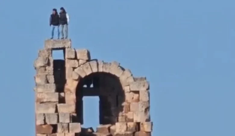 Cep telefonuna yansıyan görüntülerde tehlikeye aldırış etmeden tarihi yapıya hasar verecek şekilde zıplayıp halay çeken 2 kişi yer aldı. Bir şahsın da aşağıda halay çekenleri kayda aldığı gözlendi. Sosyal medyada paylaşılan görüntüler tepkilere neden oldu.