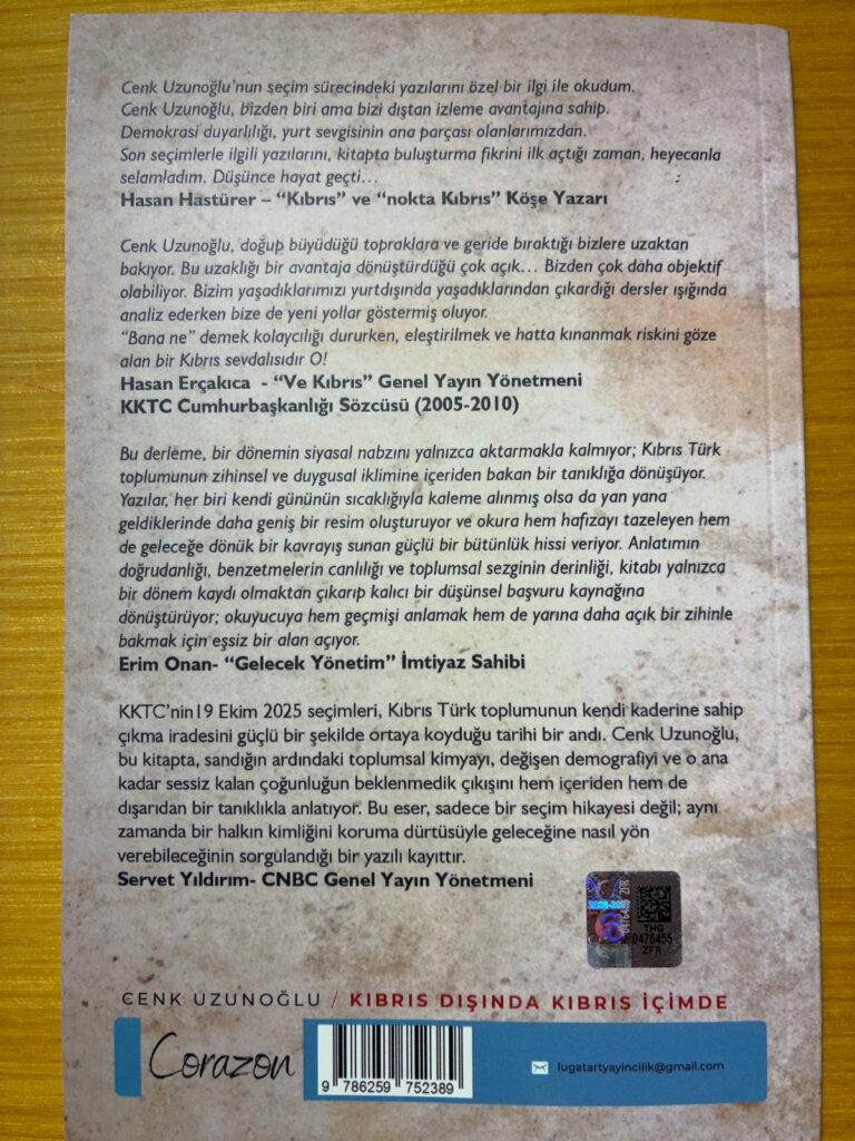 Seçim sürecinde yazdığım yazıları derlediğim “Kıbrıs dışında, Kıbrıs içimde: Uzaktan yazdığım seçim” adlı bir kitap çıkardım. Kitap yayınlamakla ilgili süreci öğrenmekle birlikte,yazmanın, kitabı yayına hazırlamaktan daha kolay olduğunu da öğrendim. Tasarımından, tedarik zincirine ve maliyetlerine kadar artık bilgi sahibiyim.